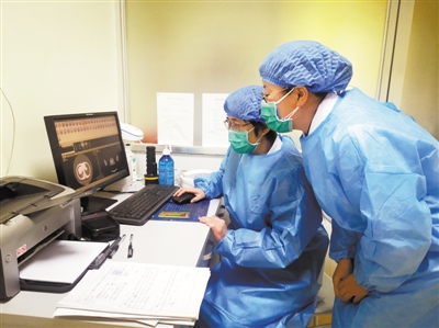 張紅(左)與陳愛美(右)正在查看患者CT檢查影像 受訪者供圖 “17年前你在醫院一線抗非典我挺你。 今天你再去醫院一線抗肺炎我仍然支持你。