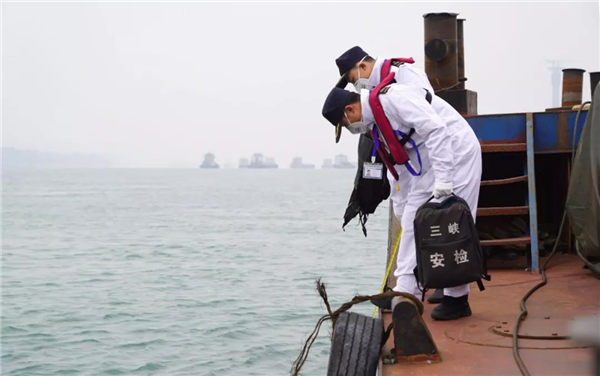 長江三峽通航管理局海事執法人員對待閘船舶進行安檢。(李光強 攝)