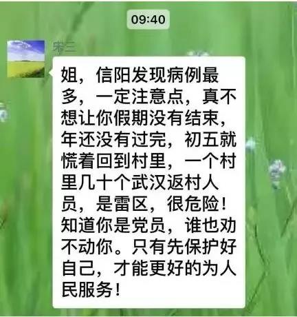 10:06,收到女兒發來的微信:“路上您口罩別摘啊,信陽都是高危地區了,您千萬要注意??!”