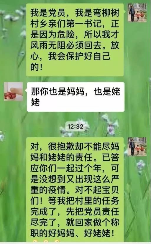 “我是黨員,我是彎柳樹村鄉親們的第一書記,正是因為危險,所以我才必須風雨無阻回村。請放心,我會保護好自己的!感謝家人親人們的理解!”