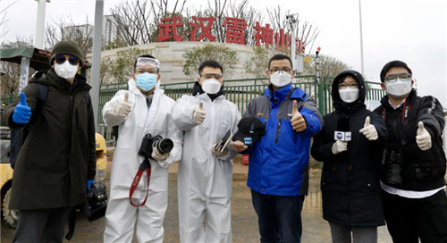 中國日報記者孟哲、朱興鑫、王曉東、吳勇、王曉瑩、蘇峰(從左至右)在雷神山醫院采訪現場(朱興鑫供圖)