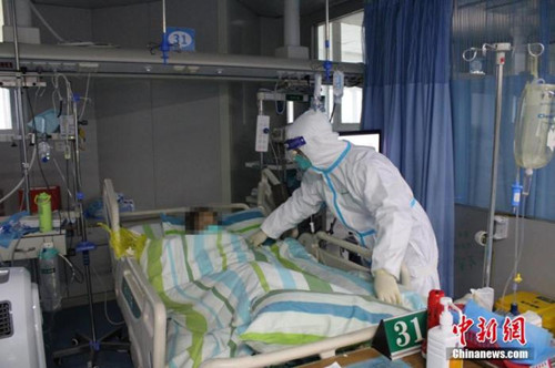 1月25日下午,武漢大學中南醫院重癥醫學科一病區,醫護人員正在為新型冠狀病毒感染的肺炎危重患者整理被褥。 中新社記者 周群峰攝
