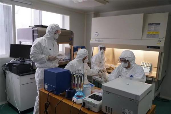 中國食品藥品檢定研究院體外診斷試劑檢定所應急檢驗第一梯隊實驗人員在做實驗。