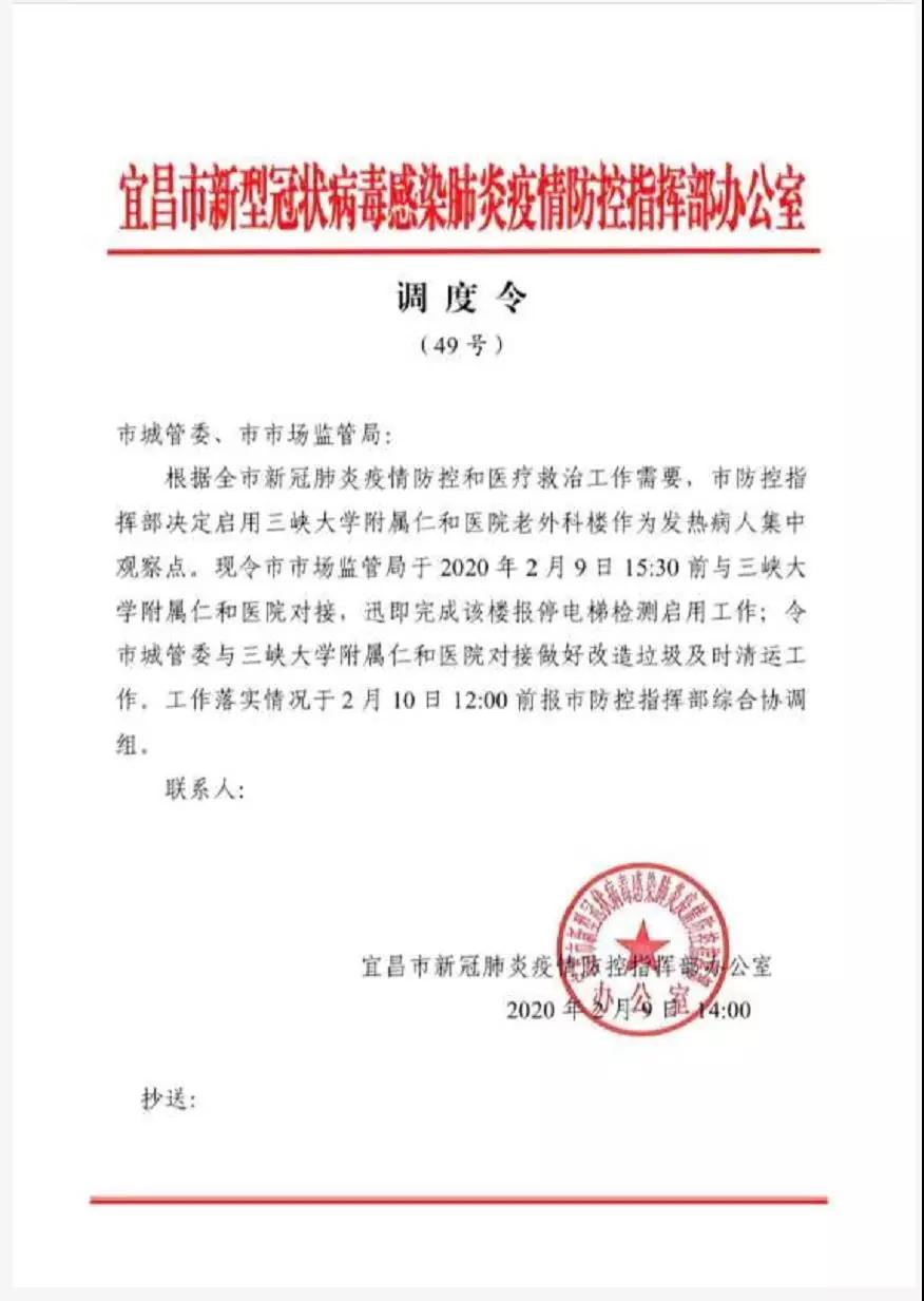時間有多緊?記者從宜昌市新冠肺炎疫情防控指揮部辦公室調度令中可以分明感受到:“現令市市場監管局于2020年2月9日15:30前與三峽大學附屬仁和醫院對接,迅即完成該樓報停電梯檢測啟用工作。”而這份調度令是當日14時簽發的。