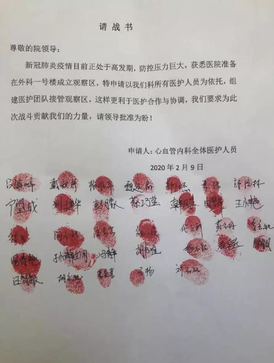 “前前后后得有200多人參與進來。”朱志峰手機里保存著一張照片。這是一張印有33顆手印的《請戰書》,里面寫到:“我們要求為此次戰斗貢獻我們的力量,請領導批準為盼!”落款是心血管內科全體醫護人員。