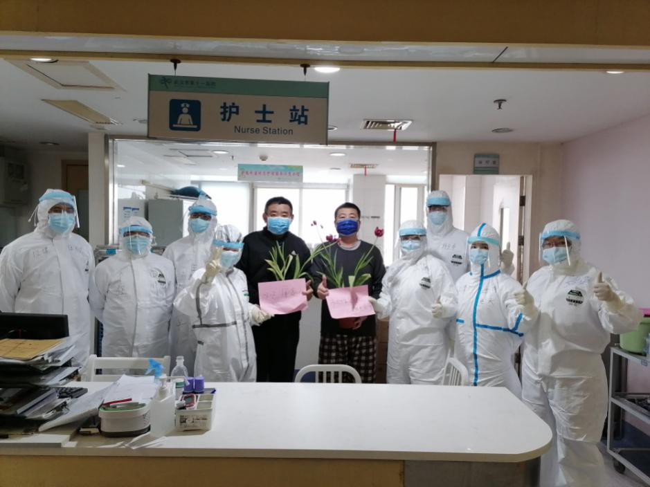 武漢市紅十字會醫院兩名出院患者與醫護人員合影(右三為邱少平/受訪者供圖)