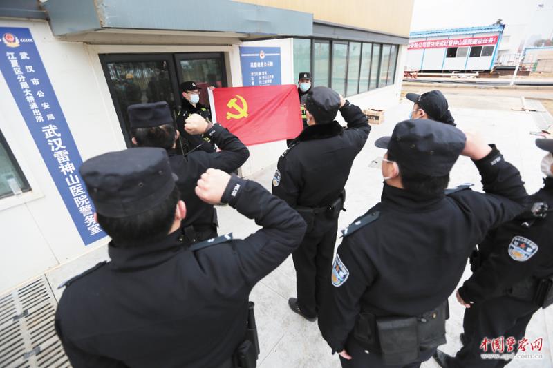 2月7日,武漢市公安局江夏區(qū)分局大橋派出所雷神山醫(yī)院警務(wù)室掛牌成立。圖為警務(wù)室民警向黨旗宣誓。