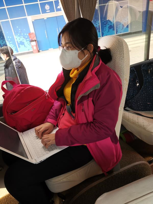 新華社國內部記者趙文君在采訪途中趕寫稿件
