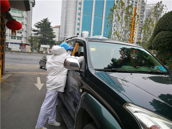 新華社門診部護士關悅協助司機進行采訪車消毒