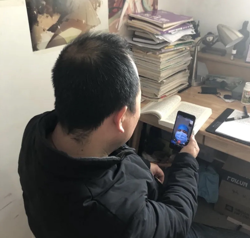 2020年2月的一天,中國鐵路太原局集團公司侯馬北工務段黨員技術員李天恩正在跟奮戰湖北防疫一線的妻子高海霞手機視頻。