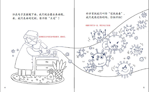 《幼兒畫報》編輯部同時成立了部門“線上編輯部”,溝通具體編輯工作事宜。經過激烈的討論,大家認為冠狀病毒圖畫書可以讓孩子們科學地理解突如其來的病毒,既能讓他們不盲目害怕,又能讓他們科學防護。但是,從長遠來看,面對這非凡、快速變化的世界,誰都無法預測,孩子們以后的一生會經歷什么。所以,大家認為,不管發生什么,“培養孩子的科學意識,培養他們正確地認識世界”,用這個永恒不變的法則,來應對萬變的世界,才是硬道理。而由《幼兒畫報》期刊延伸出來圖畫書系列正好滿足了這一需求。我們決定將這本《新型冠狀病毒走啦!》圖畫書納入到《幼兒畫報》圖畫書系列中。葉丹、齊雯經過多方協調和緊急準備,在總編室的配合下,于2月10日順利拿到了書號。同時,與印廠的對接工作也在緊張有序地進行中,在總社印務及低幼中心客服部同事的幫助下,葉丹、杜艷華多次與印廠、贈品廠溝通,協調各項印制事宜。同時,為了保證圖畫書的科學性,葉丹、《幼兒畫報》微信公眾號編輯陳慧經多方聯系,邀請了北京協和醫院龔亞紅醫生;北京市疾病預防控制中心劉秀穎副主任;首都醫科大學附屬北京安貞醫院呼吸與危重癥醫學科高楊醫生幾位權威專家學者擔任外審專家,為書稿的科學性進行了嚴密把關。此外,更有多名《幼兒畫報》《嬰兒畫報》編輯隨時待命,進行緊張的校對、核紅工作。