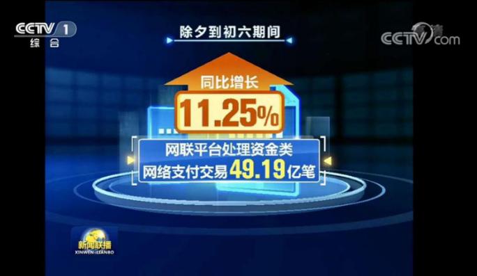 新聞聯播報道,春節假期期間,人民銀行直屬單位網聯公司管理的網聯平臺處理資金類網絡支付交易49.19億筆、金額27307.11億元,系統成功率100%。