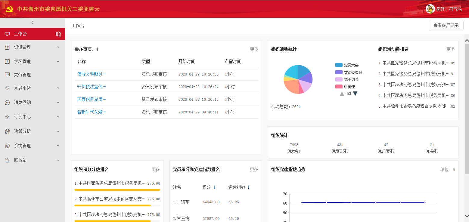 (五)智能分析輔助使決策更加科學。在互聯網條件下,通過大數據和云計算實現黨建動態跟蹤管理,大大提高了黨建管理效率,減輕了黨建管理的負擔。平臺將基層黨組織常態化建設工作任務量化賦分,并通過“資訊管理、黨務管理、學習管理、決策分析”等功能進行發布任務和督促檢查。上級黨組織登陸平臺后,可隨時調取下級黨組織工作記錄,及時了解掌握任務完成情況;基層黨組織利用本平臺通過文字記錄、活動圖片等方式發送黨建工作任務完成情況。截至2020年4月,平臺共納入了433個黨支部,8000名黨員。平臺發布了4306條資訊,學習達到3.5萬人次。共計開展組織生活2666次,其中黨員大會452次,支部委員會352次,黨小組會358次,講黨課167次,主題黨日601次,組織生活會131次,民主生活會59次,其他活動546次。為上級黨組織年終績效考核評分,評優評先、科學決策提供堅實的數據支撐,較好地解決了基層黨組織的日常工作中存在的虛化、泛化問題。