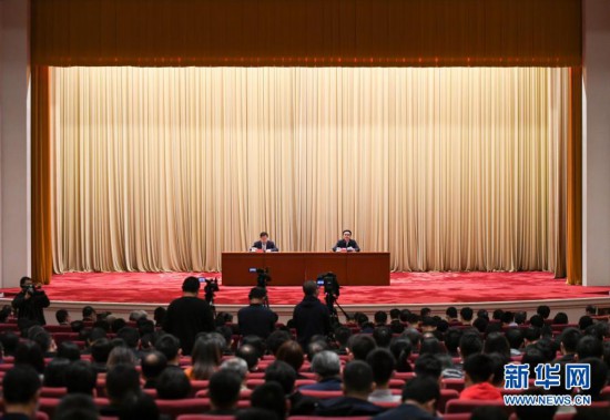 3月16日,中央宣講團(tuán)成員、中央黨史和文獻(xiàn)研究院院長曲青山(右)在報(bào)告會上作宣講報(bào)告。新華社記者 陳曄華 攝