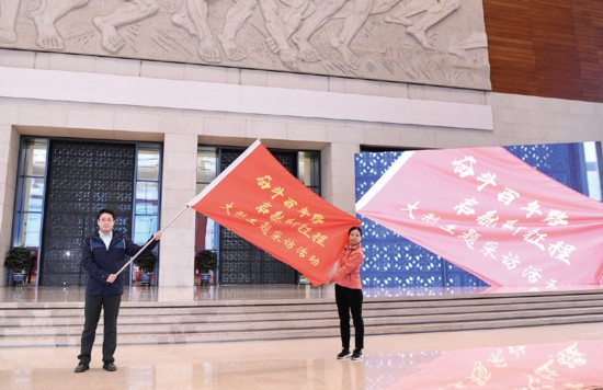 2021年1月18日,中宣部在國家博物館舉行“奮斗百年路 啟航新征程”大型主題采訪活動啟動儀式。中央和地方主要媒體的編輯記者代表在北京主會場和各省區市分會場參加啟動儀式。圖為記者代表展示“奮斗百年路 啟航新征程”大型主題采訪活動旗幟。 新華社記者 申宏/攝