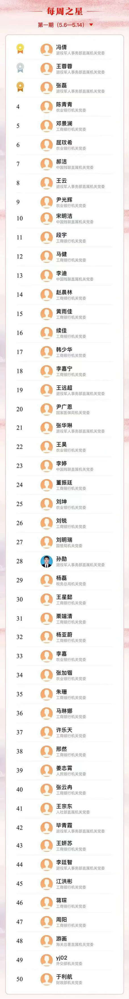“黨在我心中”中央和國家機關青年黨史知識大賽自5月6日開賽以來,各部門高度重視,青年積極參與,產生了第一期每周之星50名。
