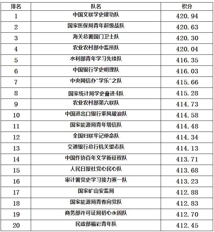 根據比賽規則,現公布第一棒積分排名前20的參賽隊。目前黨史學習接力賽第二棒《中國共產黨簡史》已結束,第三棒《習近平新時代中國特色社會主義思想學習問答》正在進行中。讀書活動將持續營造濃厚氛圍,引領學習新風尚,推動中央和國家機關走在黨史學習教育的前列。