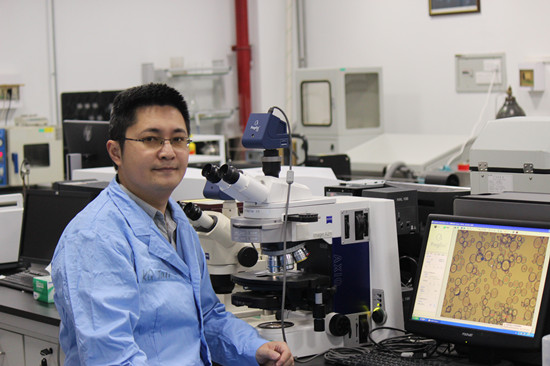 嚴開祺在實驗室進行空心玻璃微球的光學顯微測試
