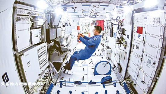 2021年6月17日,神舟十二號載人飛船發(fā)射升空。飛船搭載了一面黨旗,這面黨旗在中國共產(chǎn)黨成立100周年之際進(jìn)入中國空間站內(nèi),經(jīng)歷了我國空間站階段首次載人飛行任務(wù)取得圓滿成功的全過程。圖為2021年7月4日,在北京航天飛行控制中心大屏拍攝的天和核心艙內(nèi)航天員聶海勝配合支持兩名出艙航天員開展艙外操作。 新華社記者 金立旺/攝