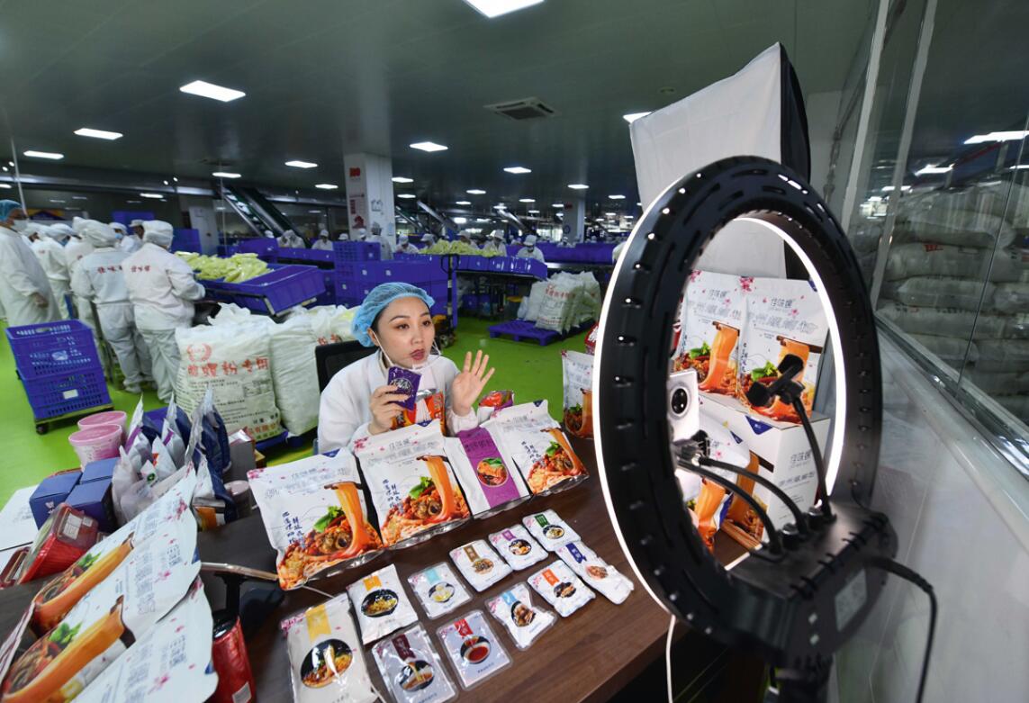 >> 在廣西一家螺螄粉生產企業車間,工作人員在直播銷售螺螄粉。