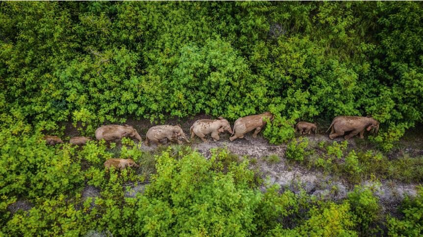 云南亞洲象群南歸。這是二O二一年八月九日在云南省玉溪市元江縣境內(nèi)拍攝的象群(無人機照片)。