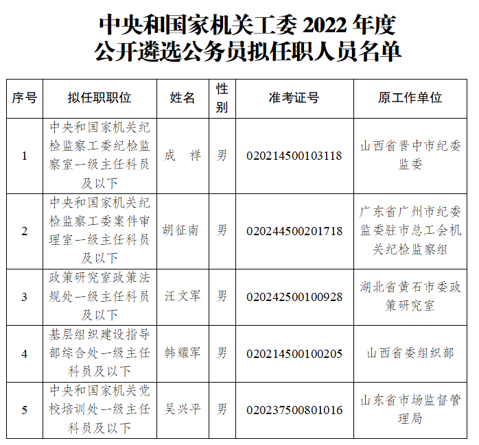 根據2022年度中央機關公開遴選公務員工作有關要求,經過筆試、面試、體檢和考察等程序,確定成祥等5位同志為中央和國家機關工委公開遴選公務員擬任職人員(名單詳見附件),現予以公示。公示期間如對人選有異議,請向中央和國家機關工委組織部反映。