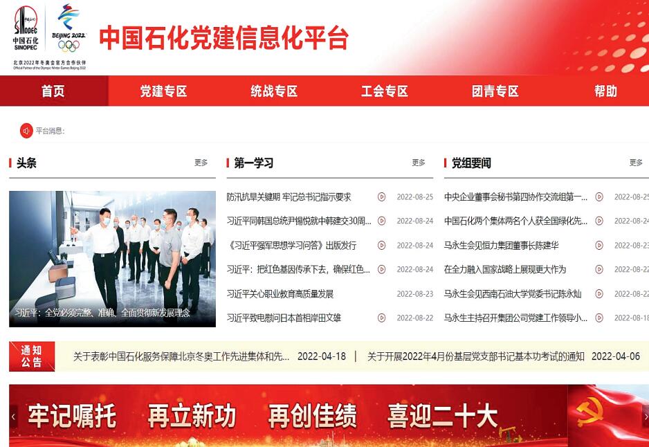 中國石化黨組認真學習領會習近平總書記關于網絡強國的重要思想和加強基層黨建重要論述精神,深入貫徹落實全國國有企業黨的建設工作會議精神和《中國共產黨國有企業基層組織工作條例(試行)》等黨內法規要求,開發建設石化黨建平臺,以信息化為黨建工作提質賦能。