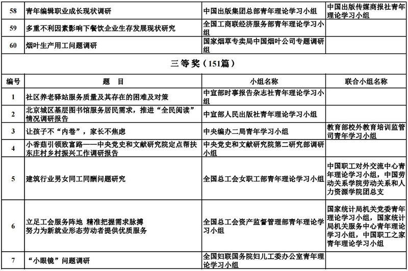 經各部門機關黨委推薦、有關科研機構復評和領導專家終評,最終評選產生了251篇優秀調研成果,其中特等獎10篇(并獲“十佳調研報告”稱號),一等獎30篇,二等獎60篇,三等獎151篇。獲獎名單如下: