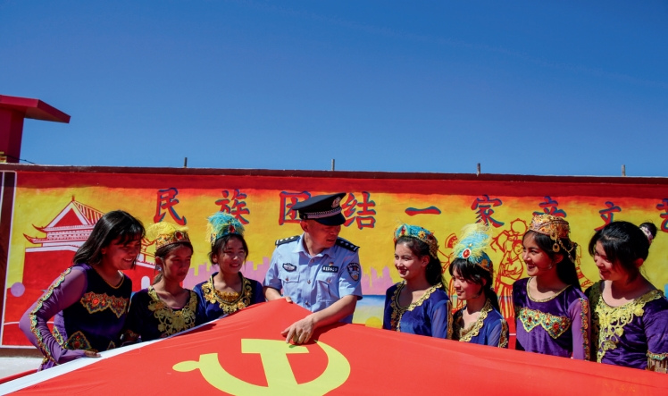 >> 2021年6月30日,新疆邊檢總站伊犁邊境管理支隊海努克邊境派出所民警向轄區少數民族學生講述黨史知識。