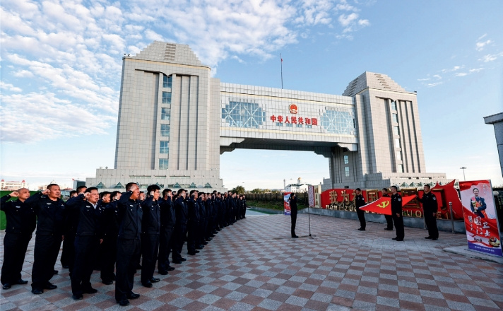 >> 2021年9月,國家移民管理局黨校第六期干部進修班學員在滿洲里國門下重溫入黨誓詞。