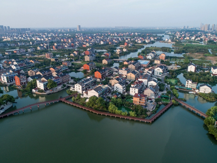 >> 天下一家,命運與共。新時代新征程上的中國將攜手世界各國共同建設美麗的地球家園,開創人類更加美好的未來。圖為空中俯瞰杭州市余杭區塘棲古鎮丁山湖邊的水上棧道和丁河村。