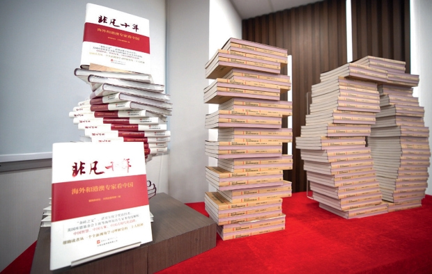 >> 12月2日,在《非凡十年:海外和港澳專家看中國》新書發(fā)布會上拍攝的書籍。