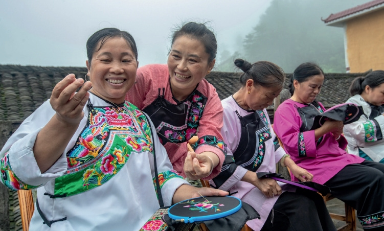 >> 2013年11月,習近平總書記在湖南湘西花垣縣十八洞村考察時首次提出了“精準扶貧”,引領億萬人民打響一場偉大的反貧困斗爭。圖為十八洞村村民在討論苗繡制作。
