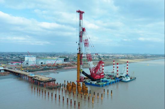 國家開發銀行江蘇分行支持的北沿江高鐵江蘇段崇啟公鐵長江大橋4號主墩施工現場。