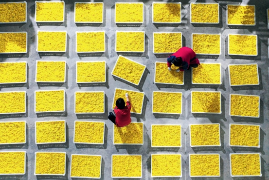 >> 村民在貴州省貴定縣云霧鎮(zhèn)一菊花加工車間攤晾金絲皇菊。