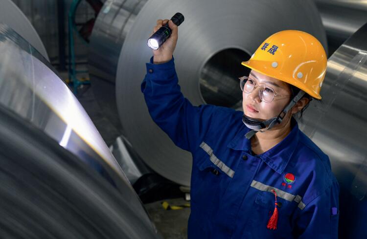 2月19日,在霍林郭勒市一家鋁業公司,質檢員在檢查鋁箔產品質量。
