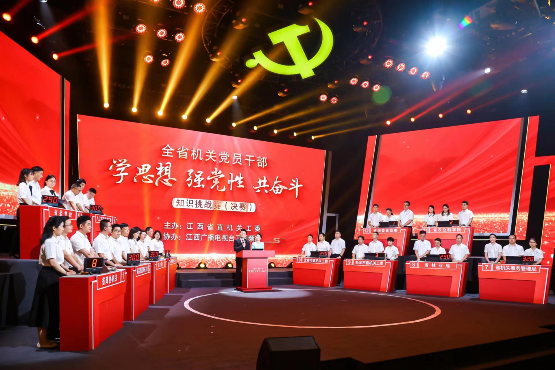 為營造學習貫徹習近平新時代中國特色社會主義思想的濃厚氛圍,推動主題教育走深走實,在組織參加全國知識挑戰賽初賽的基礎上,省直機關工委舉辦全省機關黨員干部“學思想 強黨性 共奮斗”知識挑戰賽現場賽,選拔出30支復賽隊伍。經過激烈的復賽角逐,脫穎而出的12支代表隊在江西省廣播電視臺舉行決賽。決賽分為熱身賽、12進6、6進2、2進1等環節,有展現實力的快問快答、驚心動魄的搶答、比拼耐力的車輪戰、唇槍舌劍的辯論,環環相扣,現場氣氛緊張而熱烈。比賽在江西衛視演播大廳進行現場錄播,通過今視頻、江西衛視視頻號、都市2直播、大江網、新浪微博、今日頭條等進行全媒體播出。