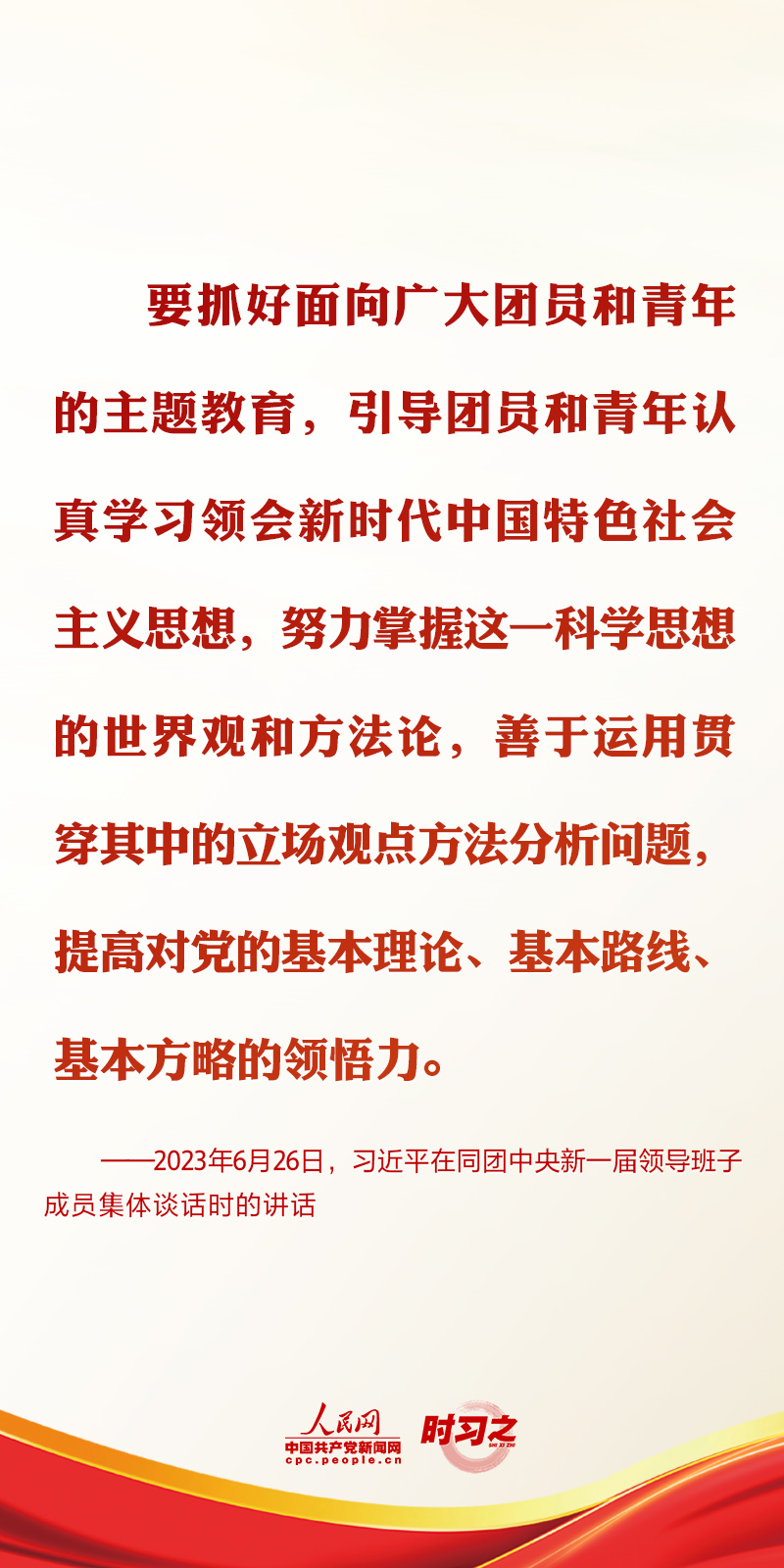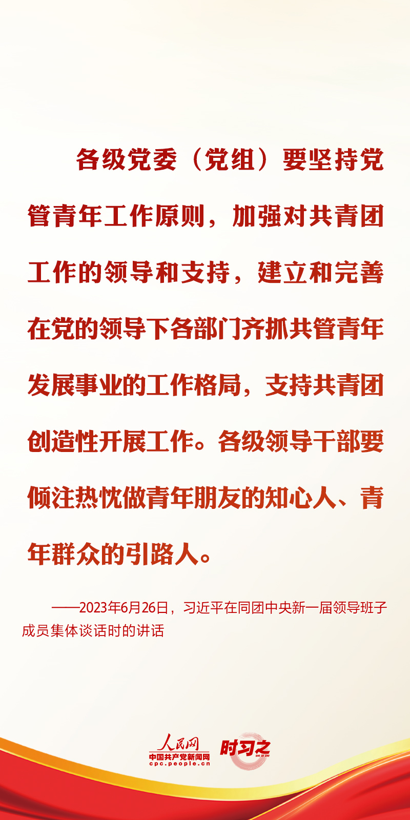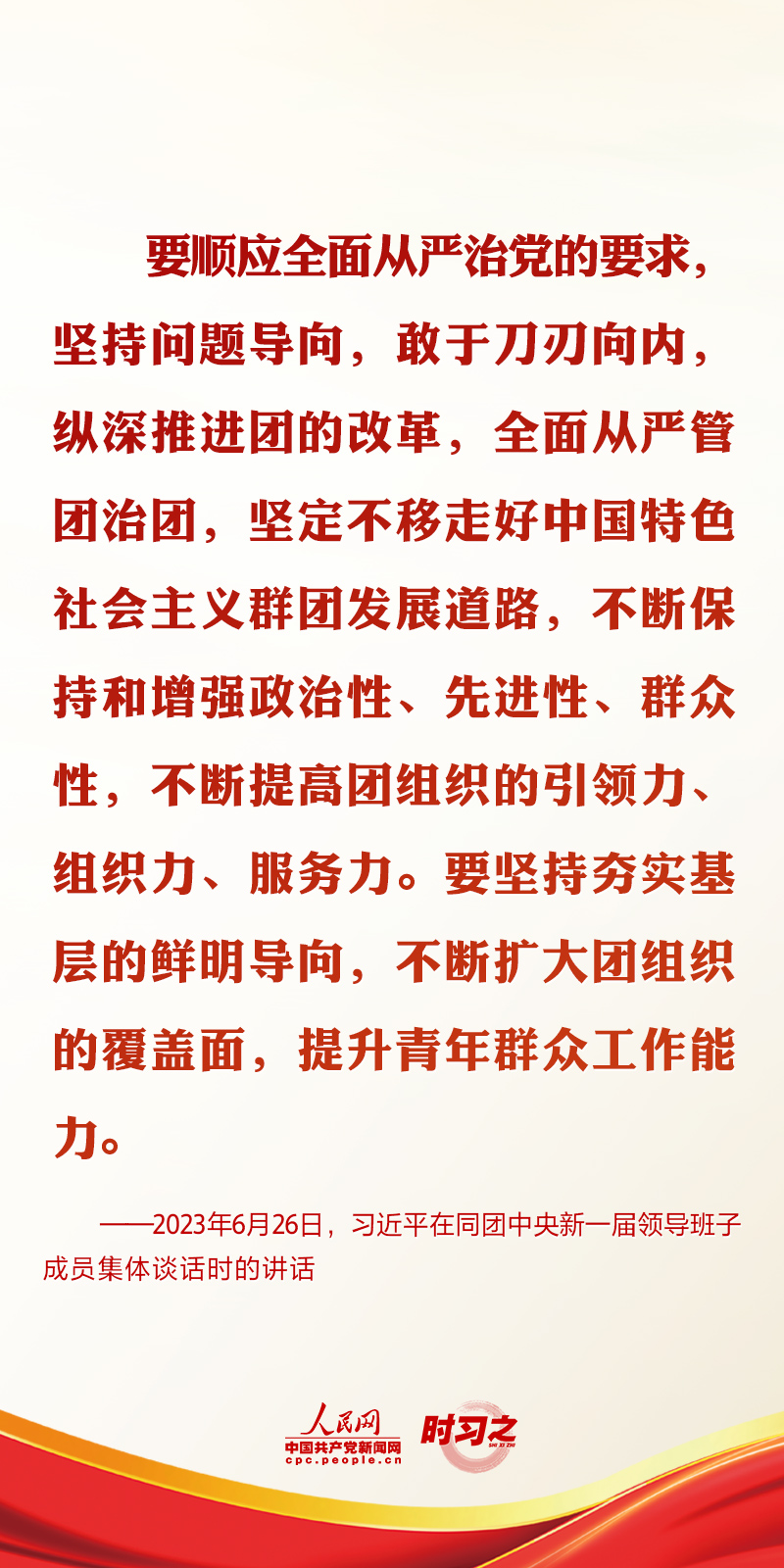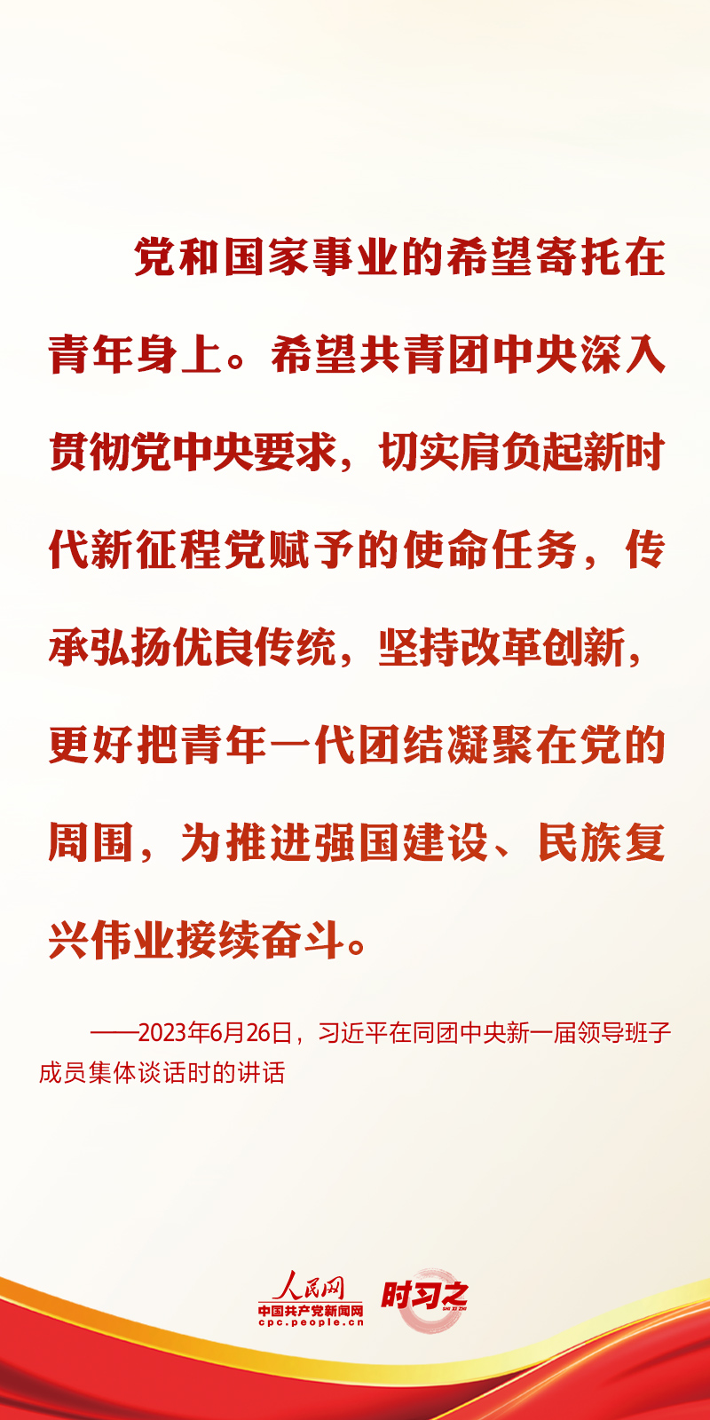2023年6月26日,中共中央總書記、國家主席、中央軍委主席習近平在中南海同團中央新一屆領(lǐng)導班子成員集體談話并發(fā)表重要講話。講話中,習近平總書記對共青團和青年工作提出了要求與希望。