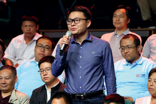 >> 葉樂峰 (中) 參加央視“對話”欄目錄制,作為媒體代表提問。