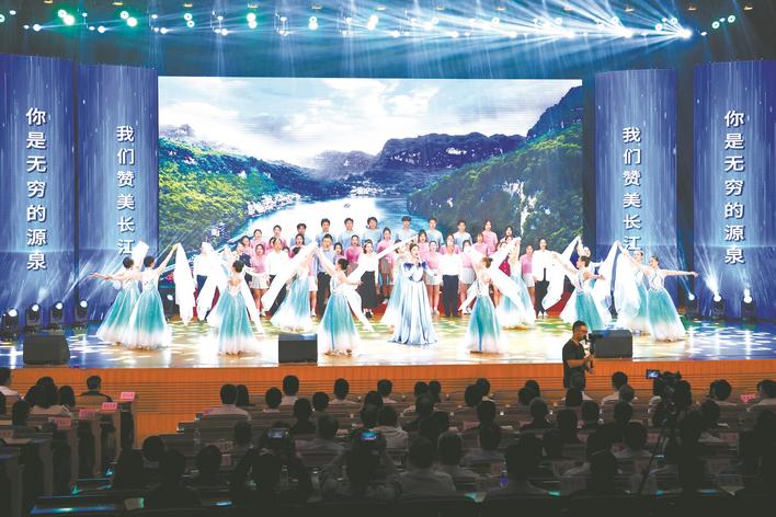 長(zhǎng)江奔騰,潮流不息。牢記囑托,奮力先行。伴著雄渾壯闊的歌聲,臺(tái)上青年代表鄭重舉起右手,重溫入黨誓詞。