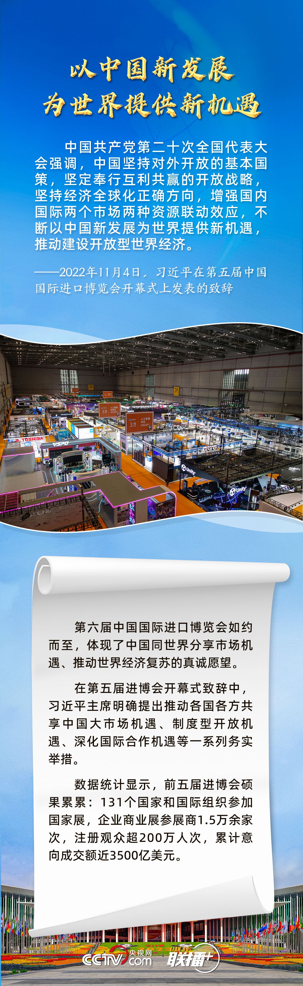 11月5日,第六屆中國(guó)國(guó)際進(jìn)口博覽會(huì)在上海開幕。習(xí)近平主席在致信中指出,2018年以來(lái),進(jìn)博會(huì)成功舉辦五屆,依托中國(guó)大市場(chǎng)優(yōu)勢(shì),發(fā)揮國(guó)際采購(gòu)、投資促進(jìn)、人文交流、開放合作平臺(tái)功能,對(duì)加快構(gòu)建新發(fā)展格局和推動(dòng)世界經(jīng)濟(jì)發(fā)展作出了積極貢獻(xiàn)。