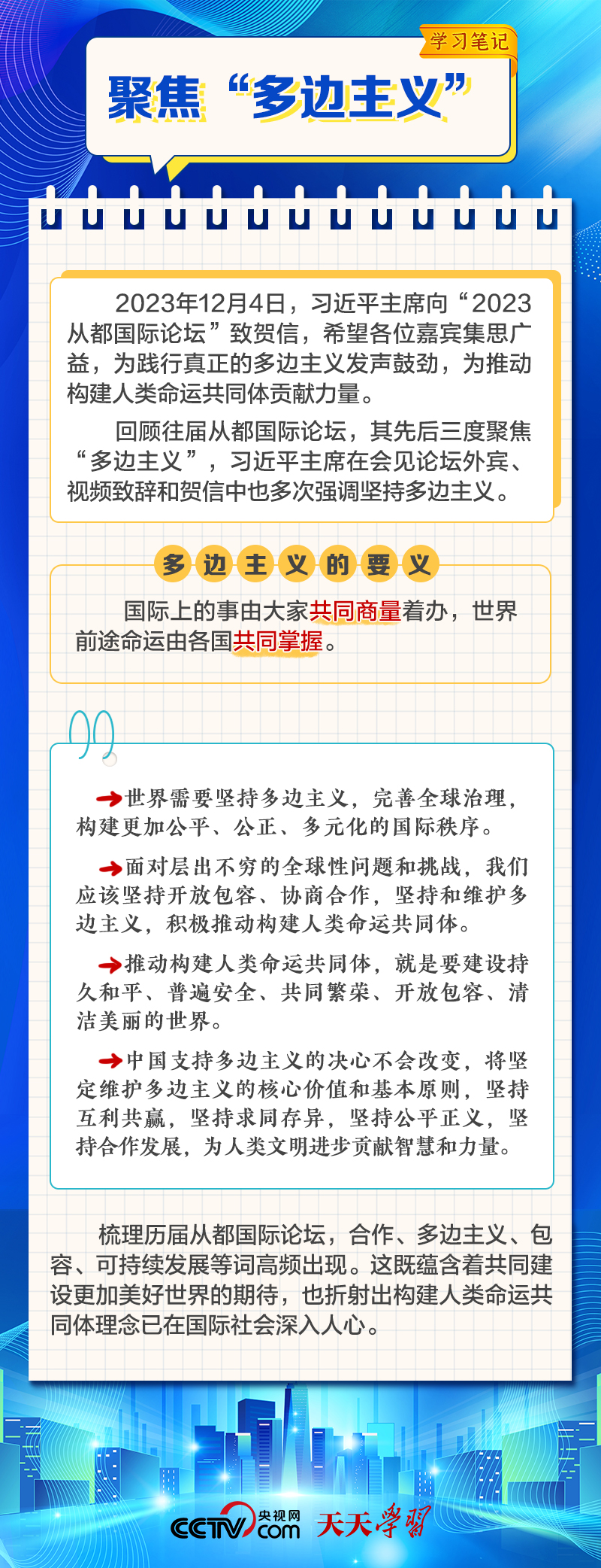 12月4日,習近平主席在致“2023從都國際論壇”的賀信中強調,面對前所未有的世界之變、時代之變和歷史之變,人類社會必須團結起來,堅持互學互鑒、開放包容、合作共贏,弘揚全人類共同價值,共同建設更加美好的世界。