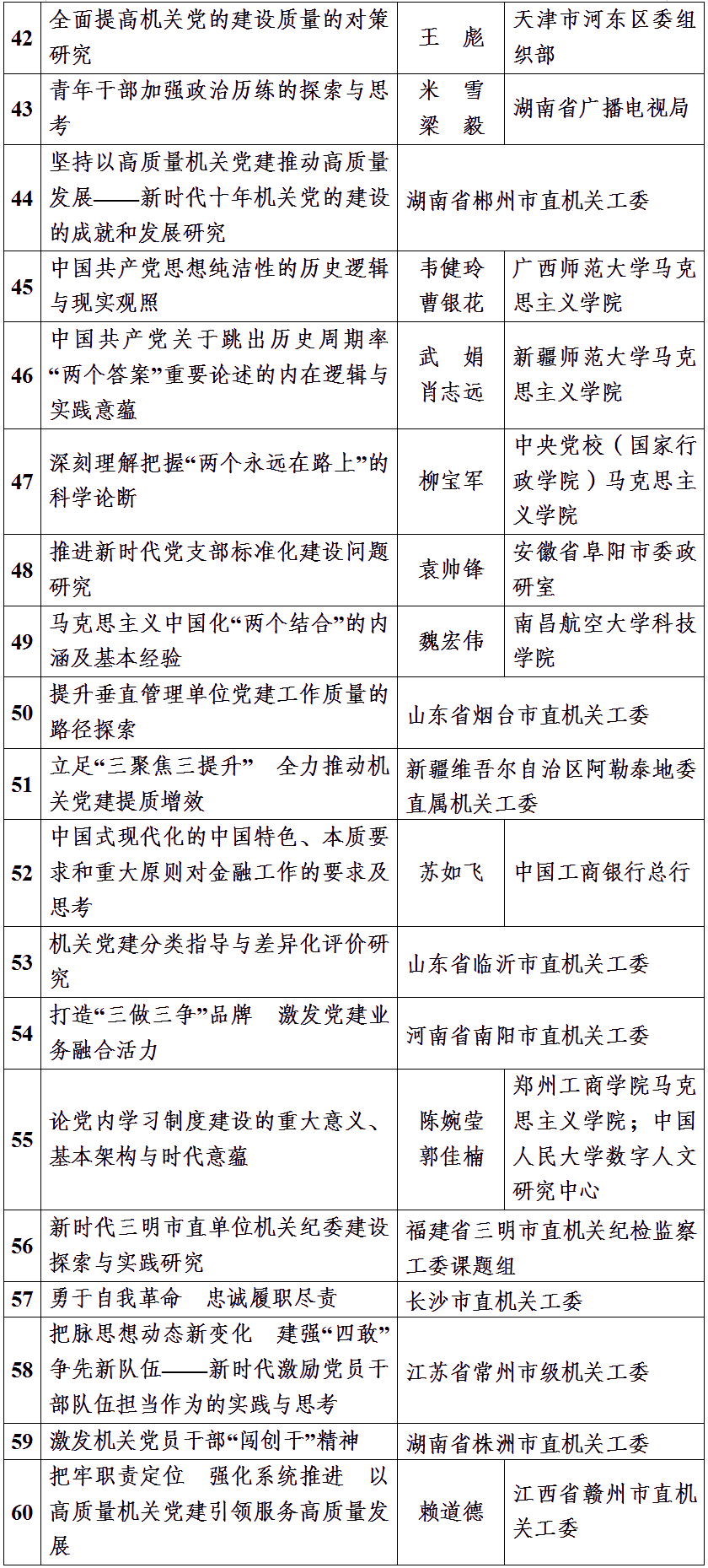 為深入學習貫徹黨的二十大精神和習近平新時代中國特色社會主義思想,持之以恒推進習近平總書記在中央和國家機關(guān)黨的建設(shè)工作會議上的重要講話精神貫徹落實,進一步做好機關(guān)黨建理論研究與交流工作,全面提高機關(guān)黨建質(zhì)量,機關(guān)黨建研究雜志社自2023年4月起開展了理論征文活動。征文活動在廣大黨員干部及理論研究工作者中引發(fā)熱烈反響,截至活動結(jié)束,共收到征文近600篇。按照公平公正原則,雜志社組織評審組經(jīng)過初評和復(fù)評,評出60篇優(yōu)秀理論征文(名單如下)。感謝廣大讀者長期以來對理論征文活動的熱情參與,希望今后一如既往地關(guān)心支持《機關(guān)黨建研究》雜志!