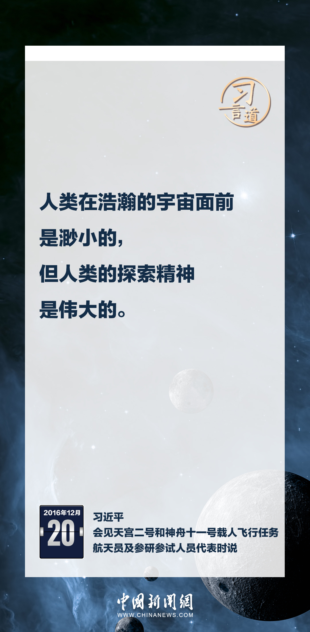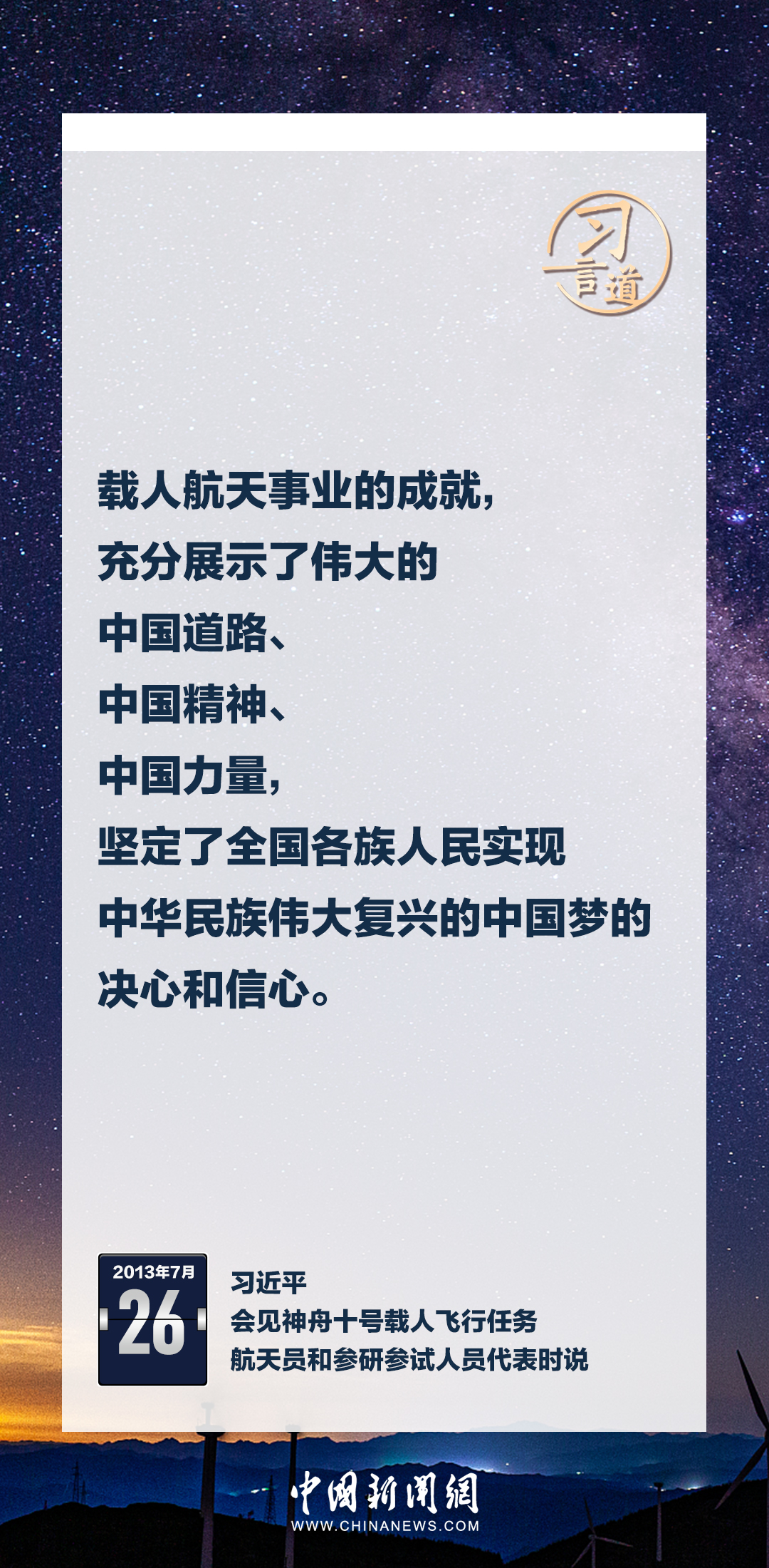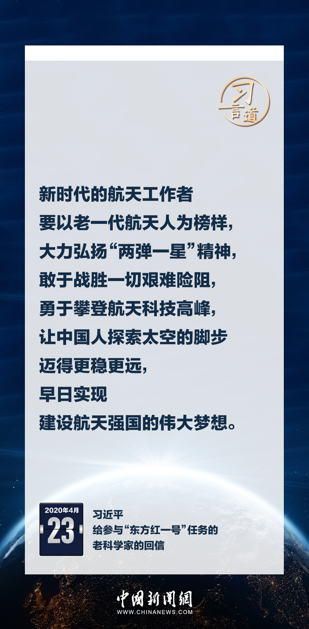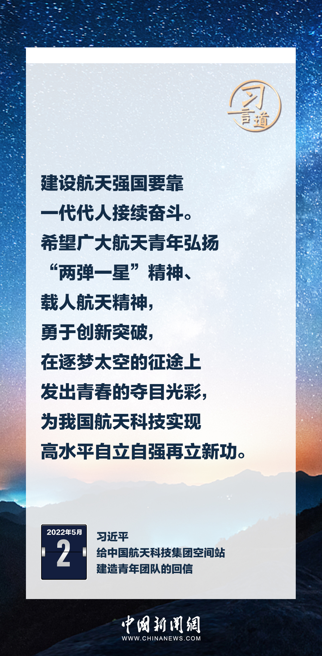 建設航天強國要靠一代代人接續奮斗。在不同場合,習近平總書記頻頻提及航天精神,激勵一代代中國人不斷奮進、筑夢太空。