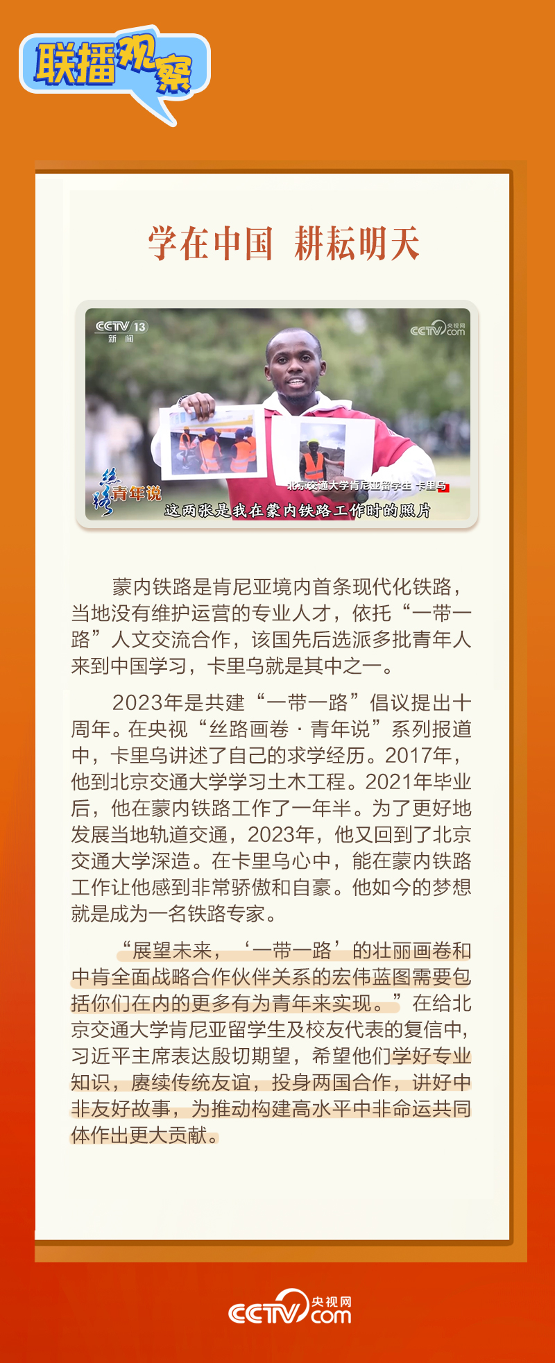 日前,北京交通大學肯尼亞留學生及校友代表致信習近平主席,表示非常高興來到中國學習鐵路運營管理知識。1月17日,習近平主席復信表達欣慰和喜悅之情,“蒙內鐵路是中肯共建‘一帶一路’旗艦項目和成功典范。我高興地看到,你們因這條‘幸福路’與中國結緣……”