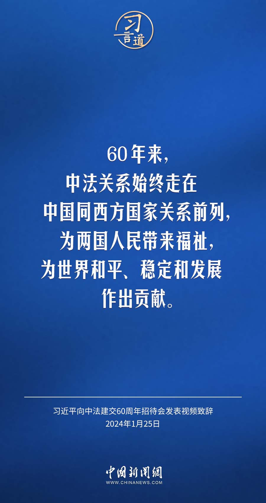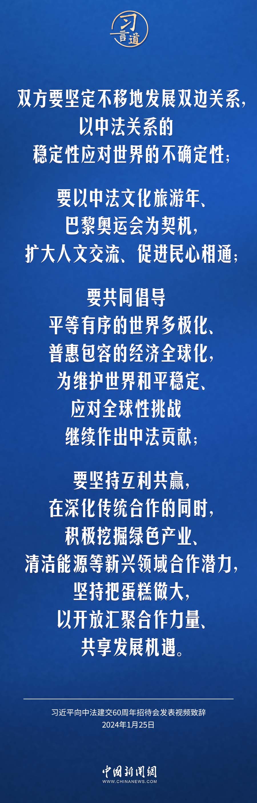 1月25日,中法建交60周年招待會(huì)在國家大劇院舉行,國家主席習(xí)近平發(fā)表視頻致辭。習(xí)近平指出——