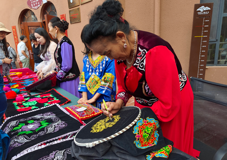 聚焦鑄牢中華民族共同體意識主線,完整準確全面貫徹新時代黨的治疆方略,中央有關部門、支援省市和中央企業積極開展對口援疆工作。圖為2023年8月23日,一位柯爾克孜族繡娘在2023“新疆是個好地方”對口援疆19省市非物質文化遺產展期間刺繡。