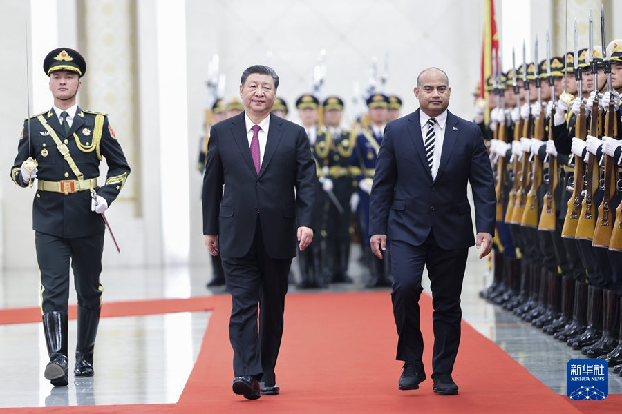 3月25日下午,國家主席習近平在北京人民大會堂同來華進行國事訪問的瑙魯總統阿迪昂舉行會談。這是會談前,習近平在人民大會堂北大廳為阿迪昂舉行歡迎儀式。新華社記者 申宏 攝
