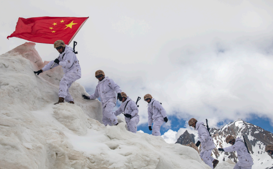 >> 2023年7月31日,駐守在西藏阿里的陸軍某邊防團巡邏分隊官兵踏雪向點位前行。