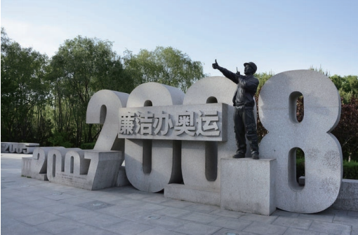 >> 位于北京奧林匹克公園中的“廉潔辦奧運”主題雕塑。